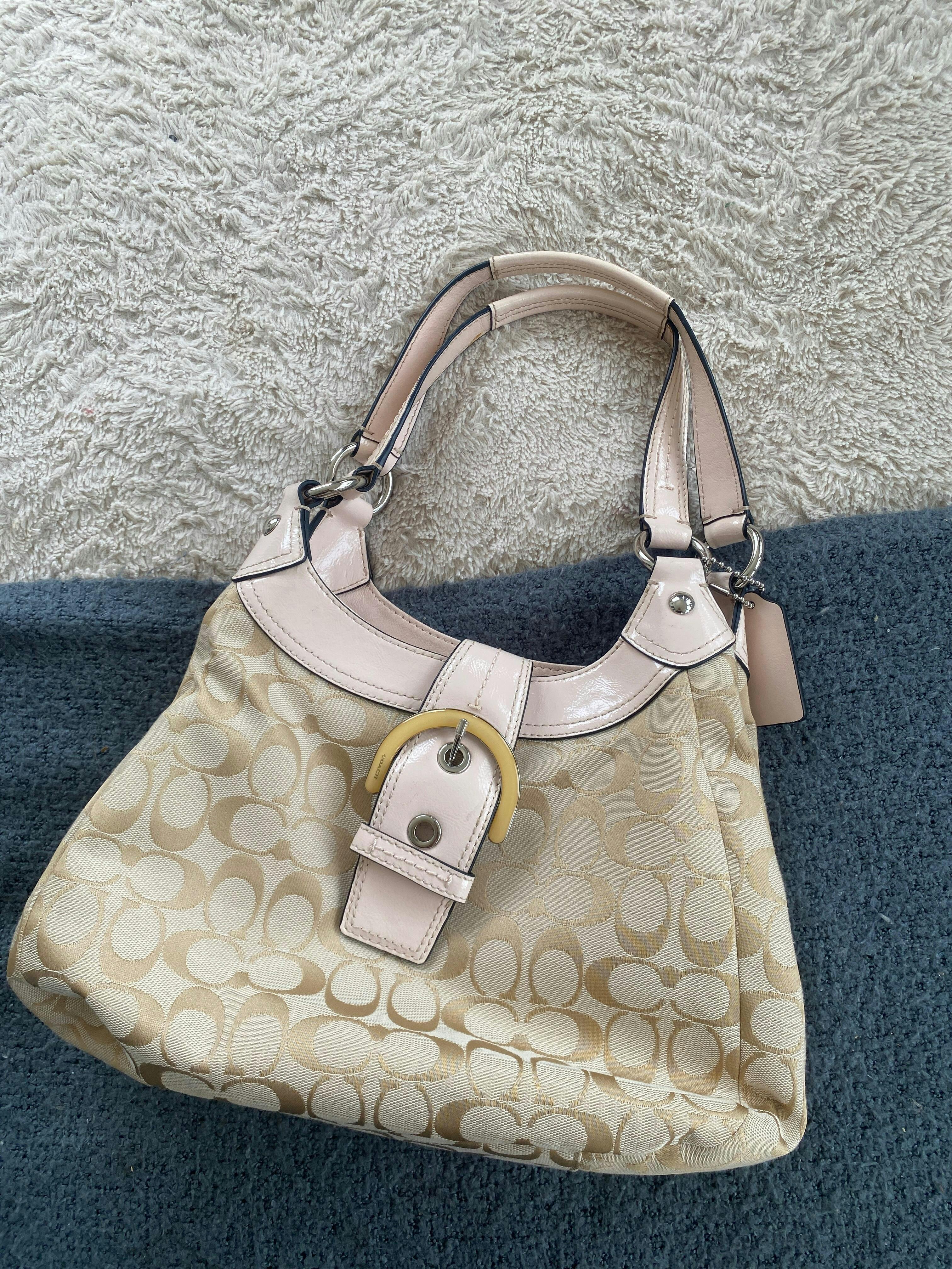 This pre-loved Coach monogram hobo shoulder bag is great for everyday use and can match any outfit with its neutral color.